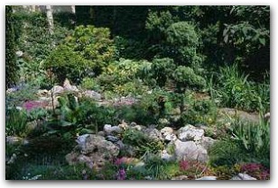 Vrt obdaja hišo s treh strani, vendar njegova površina ni prav velika. Na komaj 600 kvadratnih metrih raste nenavadno veliko okrasnega drevja, to drevje daje senco prostornemu senčnemu delu vrta, ta pa dela družbo sosednjemu, sorazmerno velikemu skalnjaku, polnemu sonca. Nekaj korakov so oddaljene sončne gredice z neverjetno množico zasajenih raznovrstnih trajnic, pa rododendroni, azaleje, vrtnice, hortenzije, okrasni iglavci in druge grmovnice - vsega skupaj več kot 800 različnih rastlin. Ne manjka tudi lepo urejen manjši ribnik z lokvanji ter drugimi vodnimi rastlinami in zlatimi ribicami v njem. In vsi ti deli vrta z vso pestrostjo rastlin se prelivajo in nevsiljivo harmonično prehajajo drug v drugega. Prav zanimivo je, kako lepo se v vrt vklaplja hiša - na čelni, južni strani ju povezujeta bujno rastoča glicinija in himalajski srobot, na vzhodni in zahodni pa so to predvsem rododendroni in azaleje.