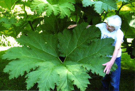 Na sliki spodaj je gunera (Gunnera). Za vrtnarjenje sta interesantni dve vrsti guner, G. tinctoria (sin. chilensis pa tudi scabra) in G. manicata. Obe vrsti sta orjaški. Ker sta si precej podobni, ni možno z gotovostjo napisati, kateri pripadajo ogromni listi na sliki.