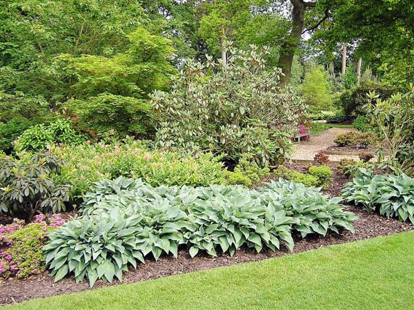Greda z rododendroni in modrolistnimi hostami. |